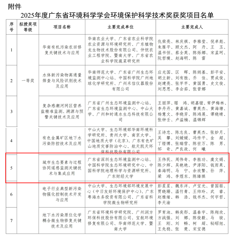 9月30日,2025年度广东省环境科学学会环境保护科学技术奖获奖结果揭晓。由我校作为主要完成单位、我院吴艳艳副教授作为主要完成人之一的研究团队所完成的科研成果——《城市生态要素与过程协同遥感监测关键技术与集成应用》,荣获一等奖。