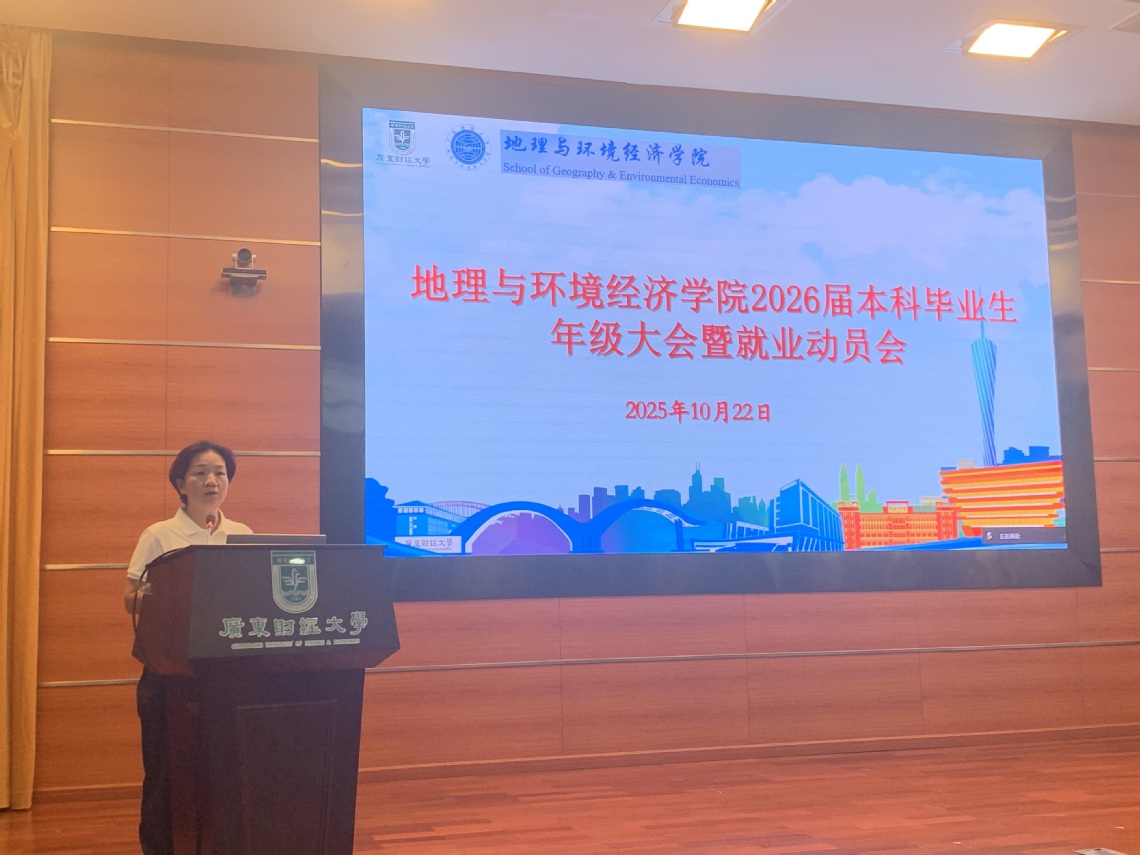 为帮助2026届毕业生明确未来方向,做好学业与职业规划,充分调动就业积极性,地理与环境经济学院于2025年10月22日下午在勤学楼408召开2026届本科毕业生年级大会暨就业动员会。学院党委书记陈莎莉、院长肖荣波等党政领导班子成员、系主任、毕业班班主任、辅导员、优秀校友代表以及2026届全体本科毕业生共同参会。会议由学院党委副书记甘乐乐主持。