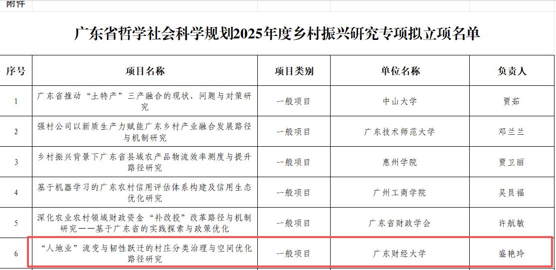 近日,广东省哲学社会科学规划2025年度乡村振兴研究专项拟立项名单完成公示,我院盛艳玲副教授申报的《“人地业”流变与韧性跃进的村庄分类治理与空间优化路径研究》项目成功获得立项资助。