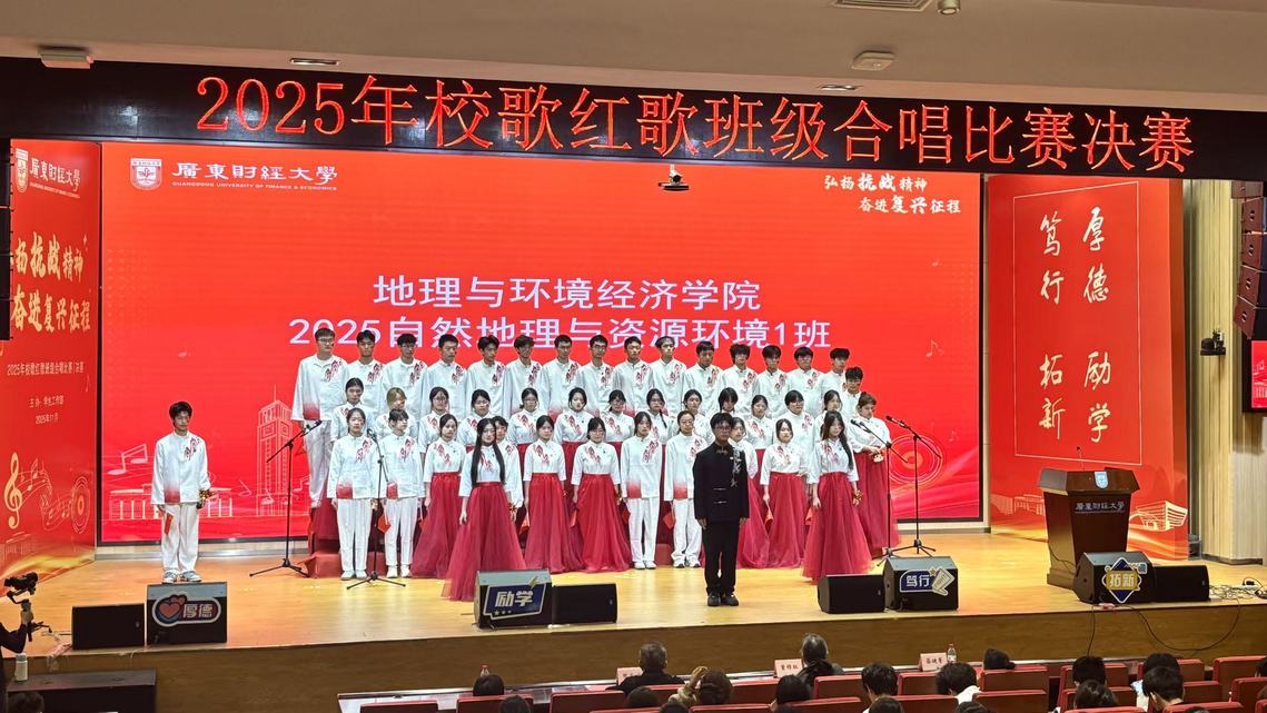 11月18日下午,广东财经大学2025-2026学年“弘扬抗战精神 奋进复兴征程”校歌班级合唱比赛圆满落幕。经过激烈角逐,地理与环境经济学院代表队——2025级自然地理与资源环境1班凭借出色表现荣获三等奖。