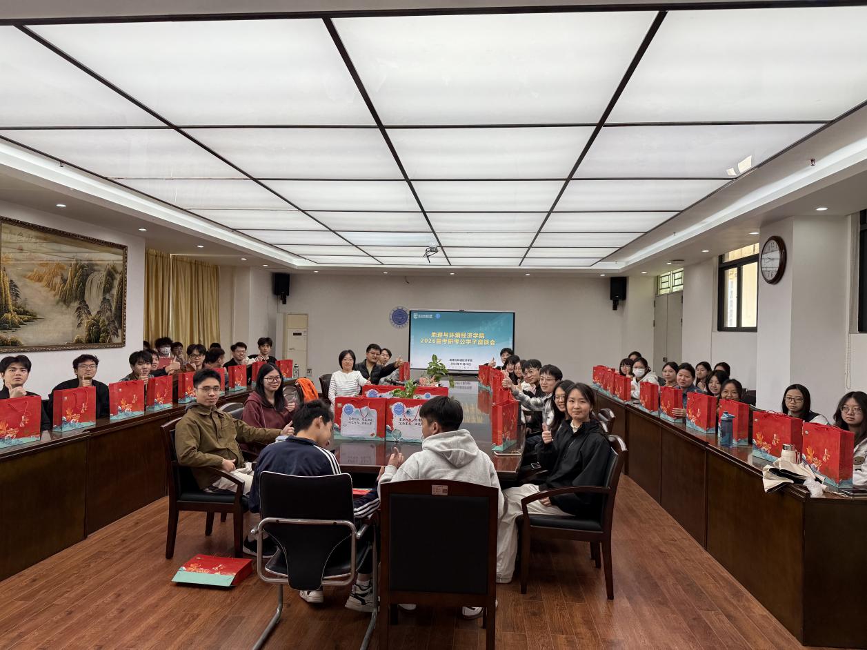 接着学院副书记甘乐乐和毕业班辅导员为参会学子送上印有“前程似锦”“终能上岸”等祝福语的文具套装。“拿到文具套装那一刻,心里特别踏实!”2022级自然地理与资源环境1班陈诗琪表示,“小小文件袋装满了仪式感,更装满了学院对我们的关爱。我会带着这份祝福全力以赴,争取一战成功!”
